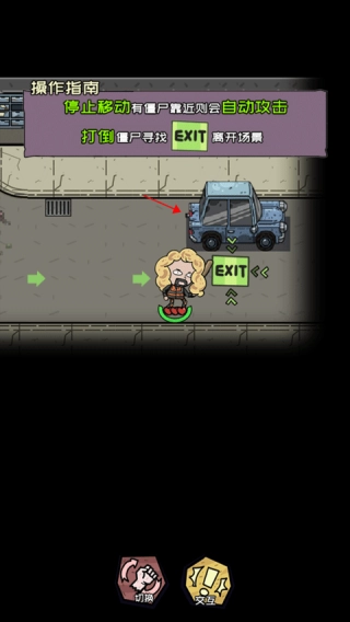 4、当你通过滑动屏幕来移动角色,会遇到僵尸,只要靠近僵尸就会自动攻击,将所有的僵尸都打败后找到“EXIT”离开当前场景。