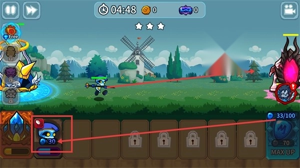 2、进入关卡后操控【等级30的蓝色角色】进行战斗,注意观察顶部显示的时间和资源数值,稳步推动对战进程。