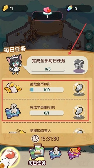 4、每天完成【拾取金币10次】【学员委托1次】这类任务,通过积累进度来兑换宝箱奖励。