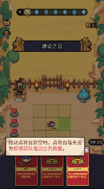 4、拖动点将台到空地上,点将台每天会为相邻部队增加士兵数量。