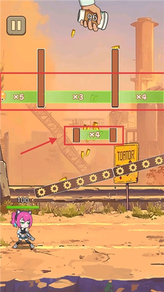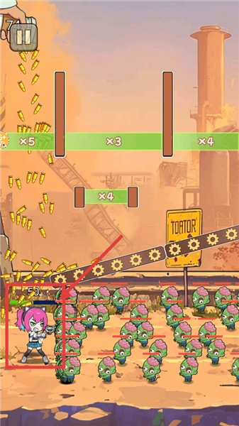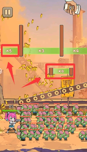 2、引导子弹穿过绿色倍数区域,让子弹数量实现倍增,以此提升火力规模来对抗敌人。