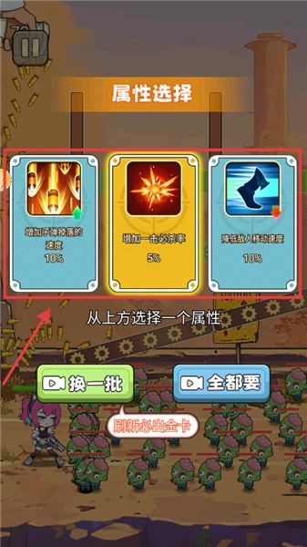 3、选择属性时需结合当前战况挑选合适选项,比如提升弹速、增加必杀率或是附加减速效果,以此优化战斗能力。