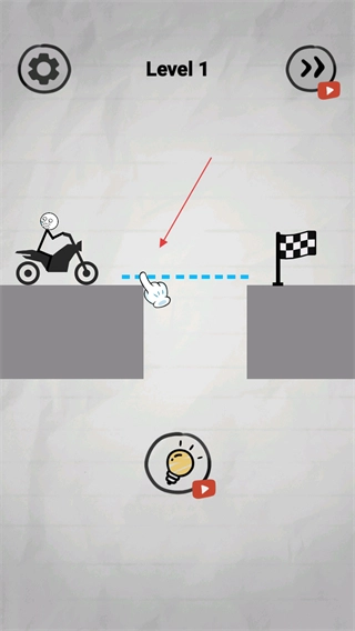 1、发现道路上有水平方向的缺口时,可直接使用画线工具画一条水平直线,把缺口左右两边的路面连接起来,这样就能让火柴人驾驶的车辆平稳穿过缺口到达终点了。