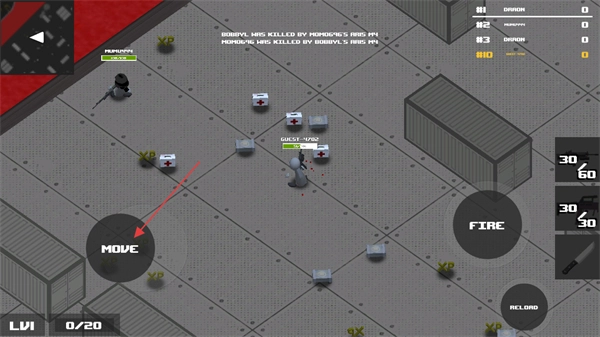 进入游戏后,你可以滑动MOVE按钮来控制角色移动,途中能拾取场景里的医疗箱补充血量,还能收集XP道具来推进等级进度。