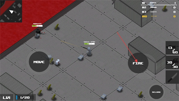 3、进入对战场景后,点击FIRE按钮即可使用武器对敌方角色发起攻击,与此同时,可利用场景内的掩体来躲避敌方伤害,以此增强对战过程中的生存能力与输出效率。
