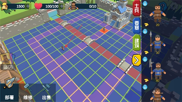 1、在初始场景中点击部署按钮,可在格子区域放置单位,结合右侧士兵选项,提前布置防御体系。