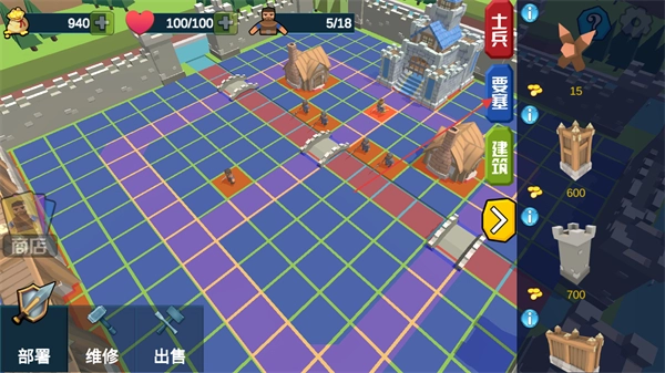 2、点击右侧要塞等建筑选项,消耗对应金币在场景格子中建造建筑,以此强化防御并提升资源获取能力。