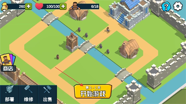3、完成单位部署与建筑建造后,点击第1-1关开始游戏按钮,即可进入该关卡的实战对战环节。