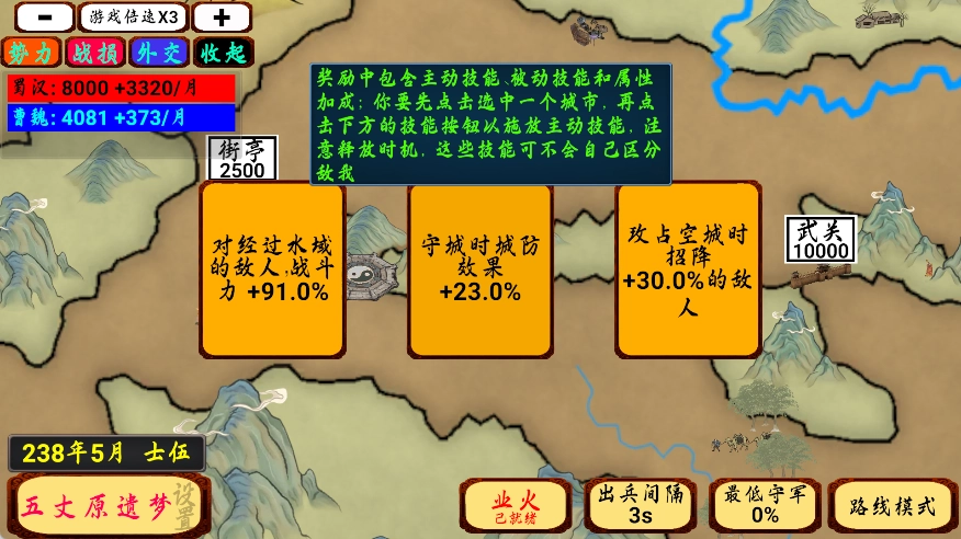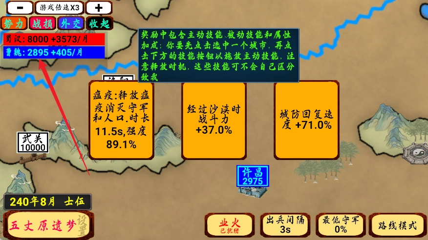 4、奖励涵盖主动技能、被动技能与属性加成。你需先点击选中一座城市,接着点击下方的技能按钮来施放主动技能,要留意释放的时机,这些技能可不会自动分辨敌我。