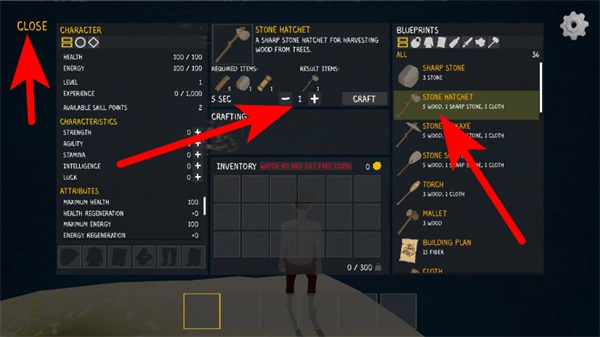 3、进入功能菜单页面后,点击CRAFTING选项,通过选择对应的材料,就能制作出工具之类的物品。