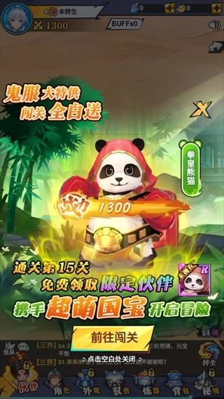 通过第15关即可免费获取限定伙伴【拳皇熊猫】,它能助力你开启冒险之旅并提升战斗能力。