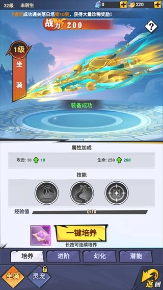 借助【一键培养】功能来强化坐骑技能,通过提升等级实现进阶,能够显著增加攻击与生命属性,从而有效提升战力。