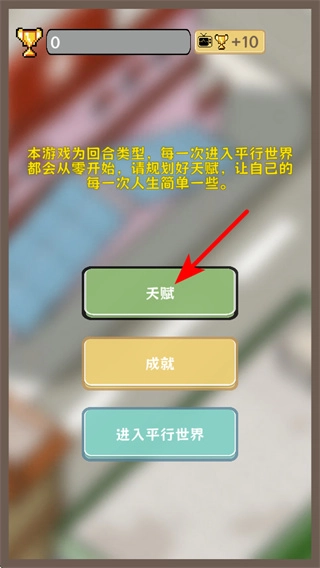 2、在游戏说明界面,点击天赋按钮即可进入天赋系统界面,该界面是规划天赋以提升初始优势的入口。