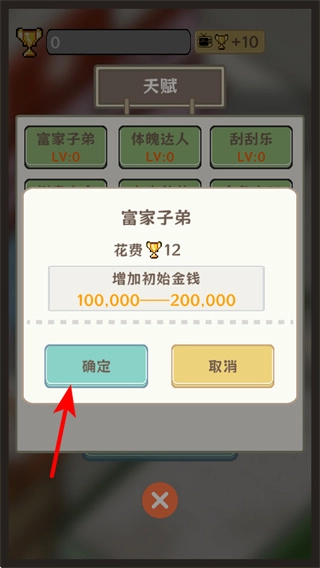 3、在天赋界面选定富家子弟天赋后,点击确定按钮,就能消耗奖杯解锁此天赋,增加初始金钱的数额。