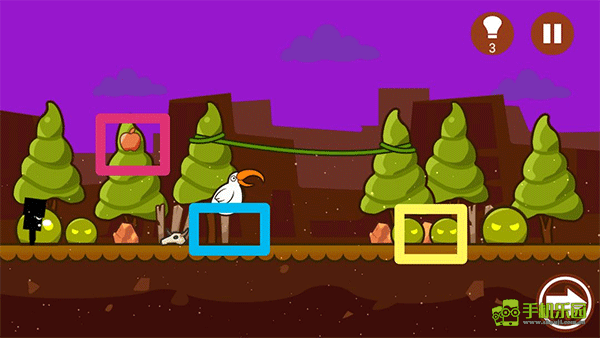 2、树上的苹果多点两下给大白鸟吃,鸟飞走后可以拿到它栖息的那根木棍~别忘了黄色框里的打火石。