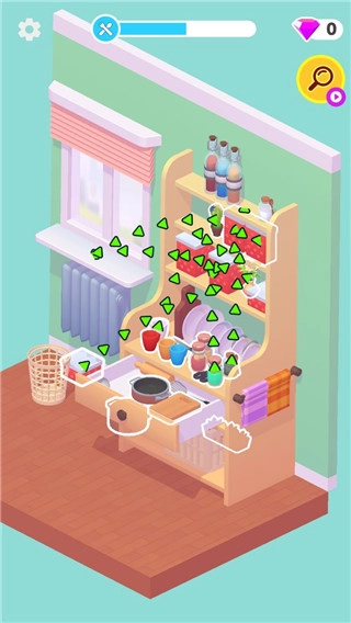 不确定你要打开的物品该放置在何处?点击放大镜图标,游戏的帮助功能就会为你显示每件物品的最佳存放位置,这样能最大程度保持整洁并方便使用。