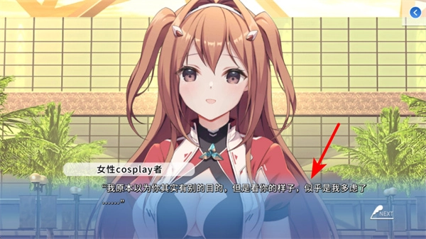 3、对话暂停时,点击红色箭头指向的NEXT按钮,能继续触发后续的角色台词与互动情节。
