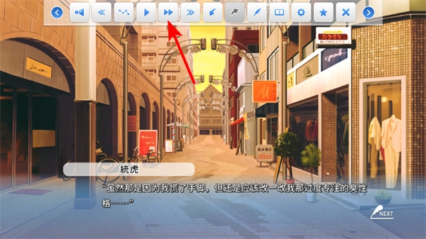 4、在界面顶部的功能栏中,点击箭头指向的按键,可调整剧情的播放进度,控制对话推进节奏。