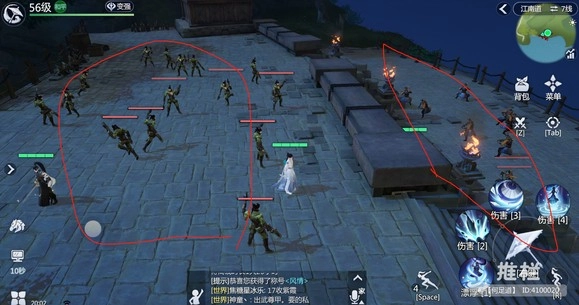 瞧这地方密密麻麻的怪物,这个点位绝对是55级之前最棒的刷怪点(对面红色圈区域同样挤满了怪物,只是距离太远没显示出来,这个点位4个人能同时清理两拨怪)