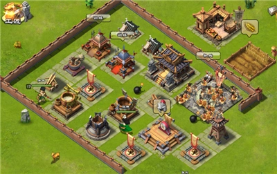首先和传统塔防游戏类似,建造建筑类的农田、集市、粮仓、金库等;军队类设有练武场、军营、旌旗、点将台、盟军大帐等;防御类则包含流星弩、弓箭塔、城墙投石车等。