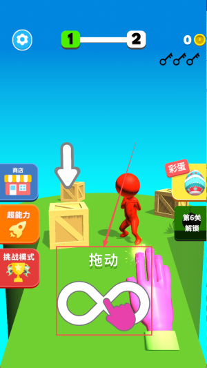 1、进入关卡后,点击屏幕操控橡皮人移动,碰到障碍物时,通过把控点击的力度和时机,让橡皮人迅速穿过。