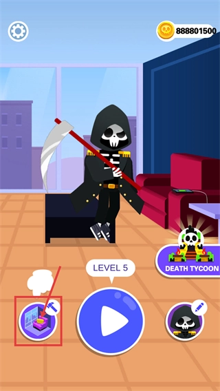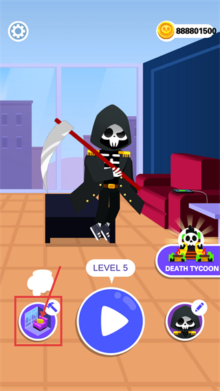 1、进入【LEVEL-5】之前,先点击左下角的道具图标解锁场景装饰,之后再启动蓝色按钮进入【DEATH-TYCOON】关卡。