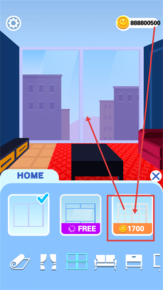 3、地板装饰完成后,花费【1700】货币解锁网格窗户装饰,持续进行场景装饰能够解锁更多关卡道具。