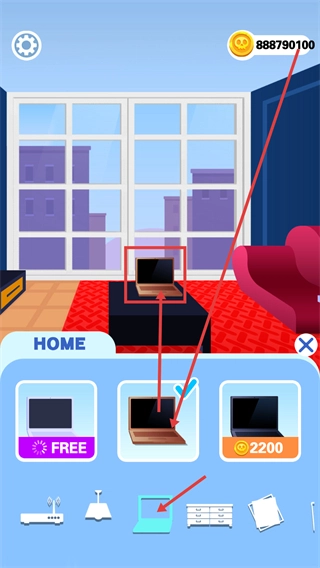 4、在【HOME】界面挑选棕色笔记本电脑样式的装饰,花费相应货币来布置场景,就能解锁后续的关卡内容。
