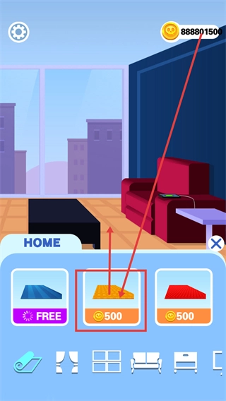 2、在【HOME】界面中,消耗【500】货币解锁黄色地板装饰,能提高场景装饰度,从而推动关卡进度。