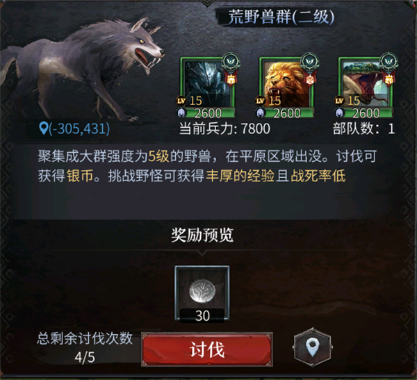讨伐野怪不仅能获取丰厚的经验奖励,而且部队的损耗相对较低。因此建议各位玩家每天都把讨伐野怪的次数用完,这样就能积累到大量的英雄经验了。