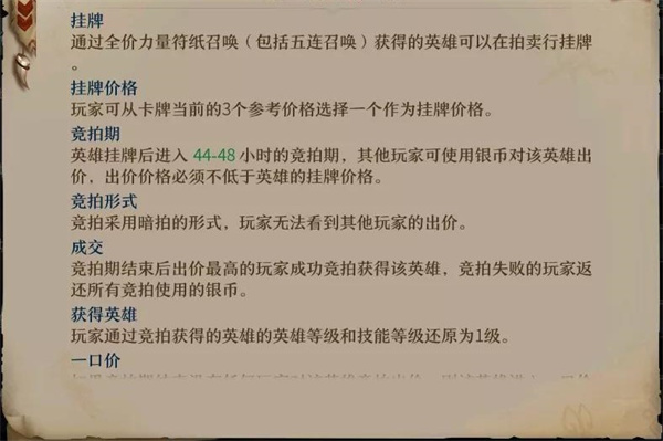 只有通过全价力量符纸召唤得到的英雄,才能够在拍卖行挂牌售卖。