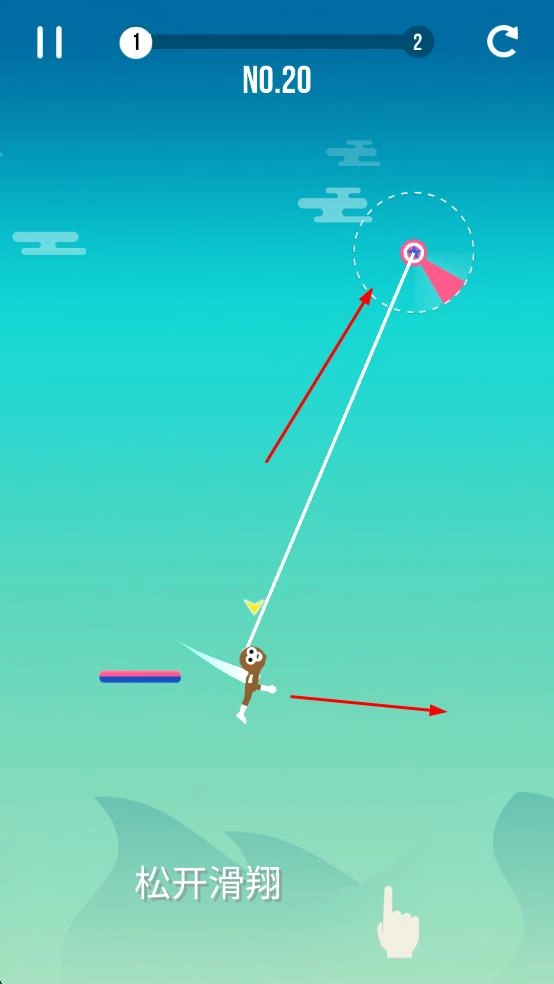 简约画面搭配虐心玩法:画面风格清新简约,视觉呈现干净舒适,没有多余元素造成干扰;操作方式虽然简单,但玩法却极具“虐心”属性,玩家操控绳子飞行时,很容易因为衔接失误或者方向偏差而失败。