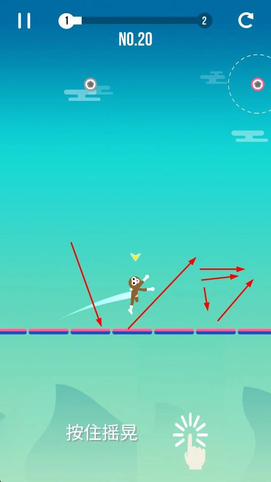 按住屏幕并摇晃角色,调整其摆动的方向和力度,以适配路径,避开障碍并衔接至下一个节点。