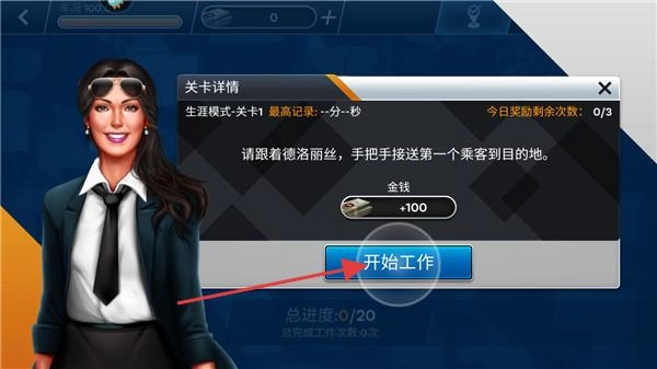 在【关卡详情】页面,点击【开始工作】按钮,按照指引完成乘客的接送流程,从而达成首单任务。