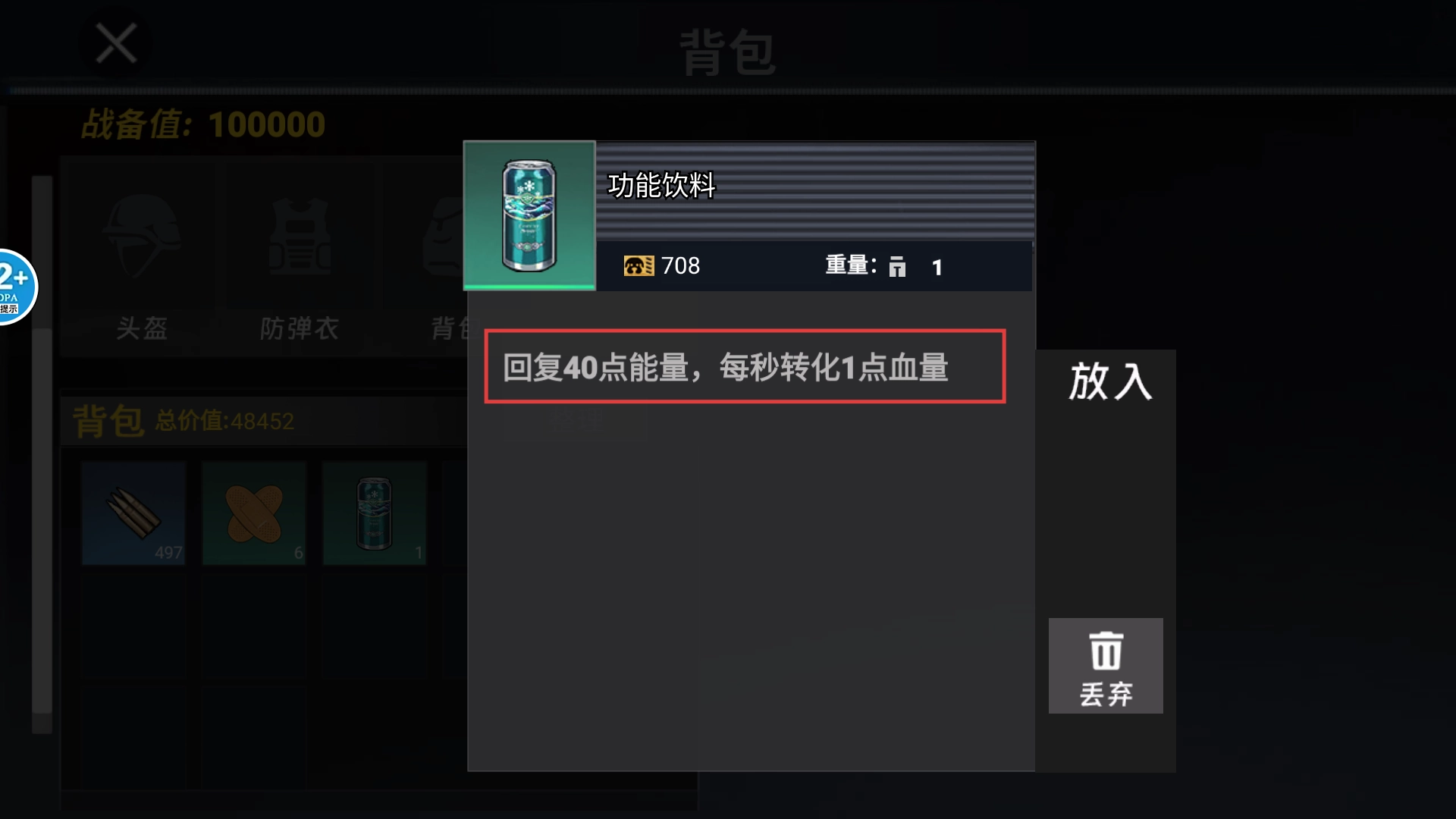 1、战斗前将【功能饮料】放入背包,其能回复40点能量且每秒转化1点血量,可提升修狗的生存续航。