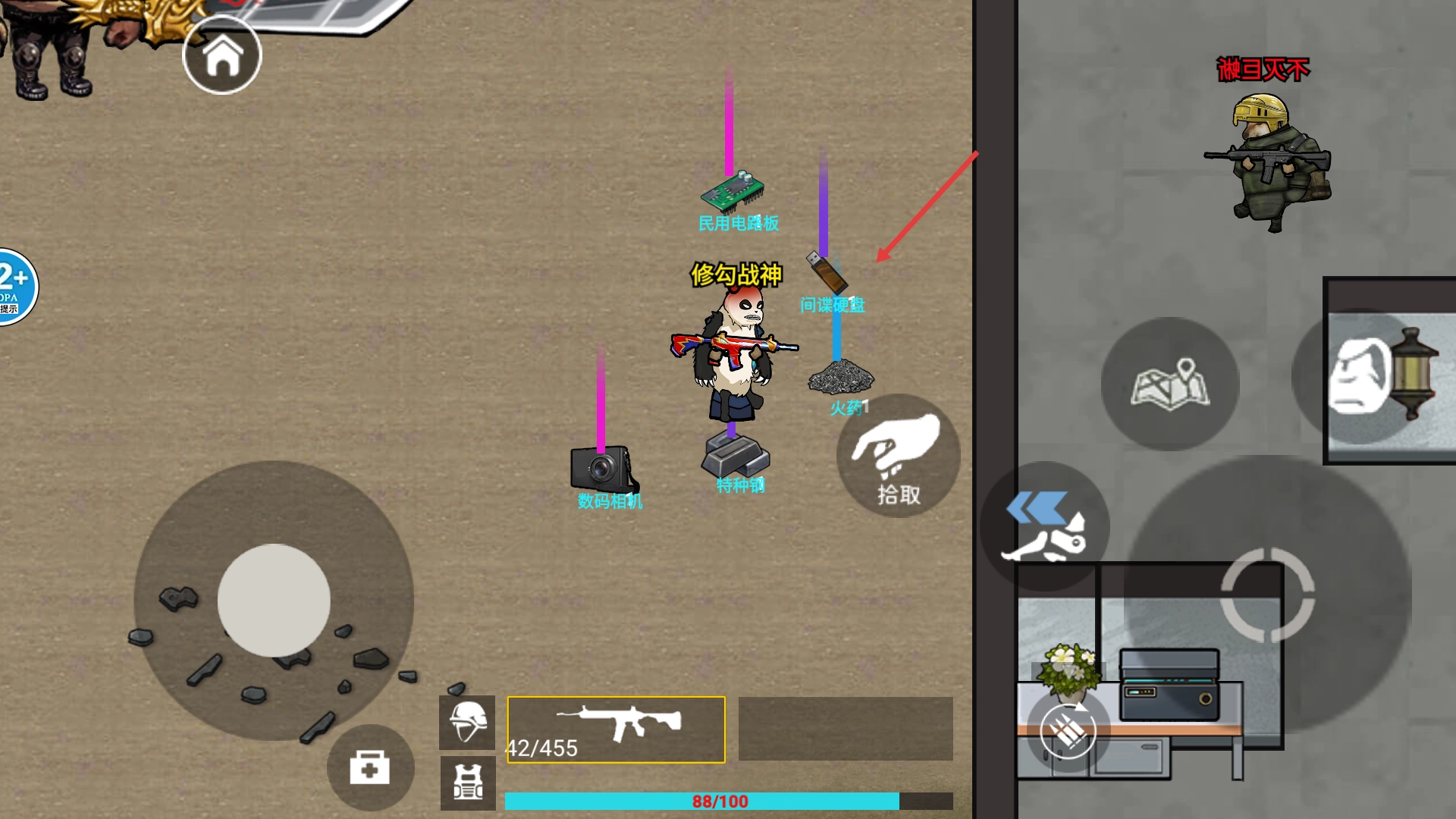 2、在战场中拾取【民用电路板】-【间谍硬盘】等道具,获取资源以提升战力,为后续撤离做充足准备。