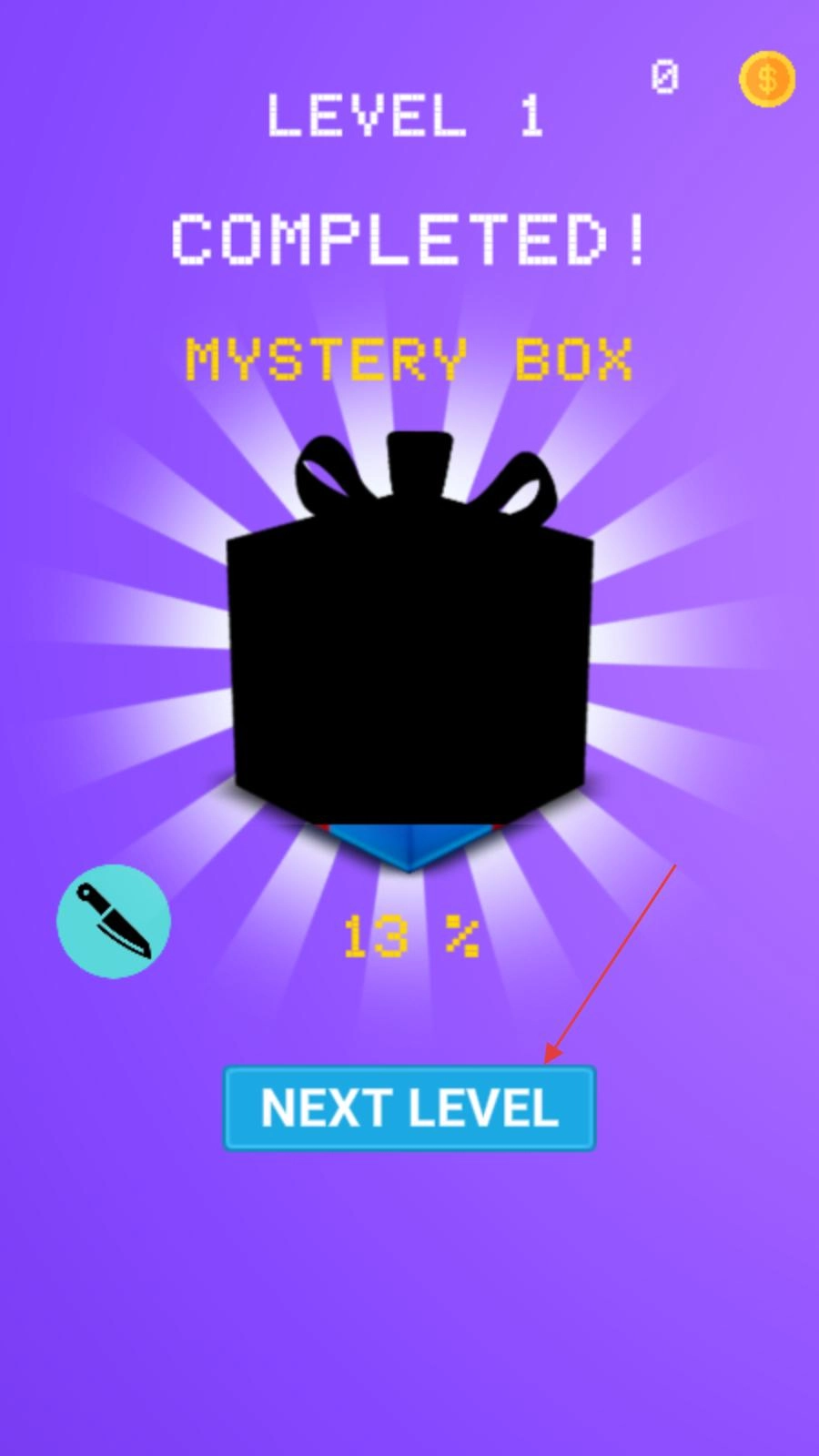 完成第一关后,游戏会弹出关卡完成界面,界面上有神秘礼盒,同时显示13%的进度;点击下一关按钮,即可进入第二关继续游戏。