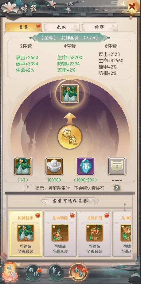 消耗套装材料可将装备升级为【至尊】套装,还能进一步提升至更高级别的【无双】套装。