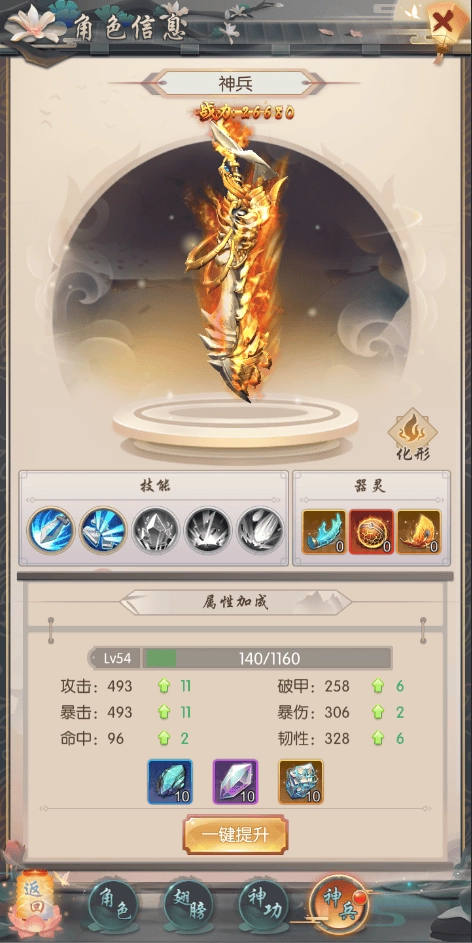 神兵也能通过搭配不同等级的器灵来获取更多属性加成;
