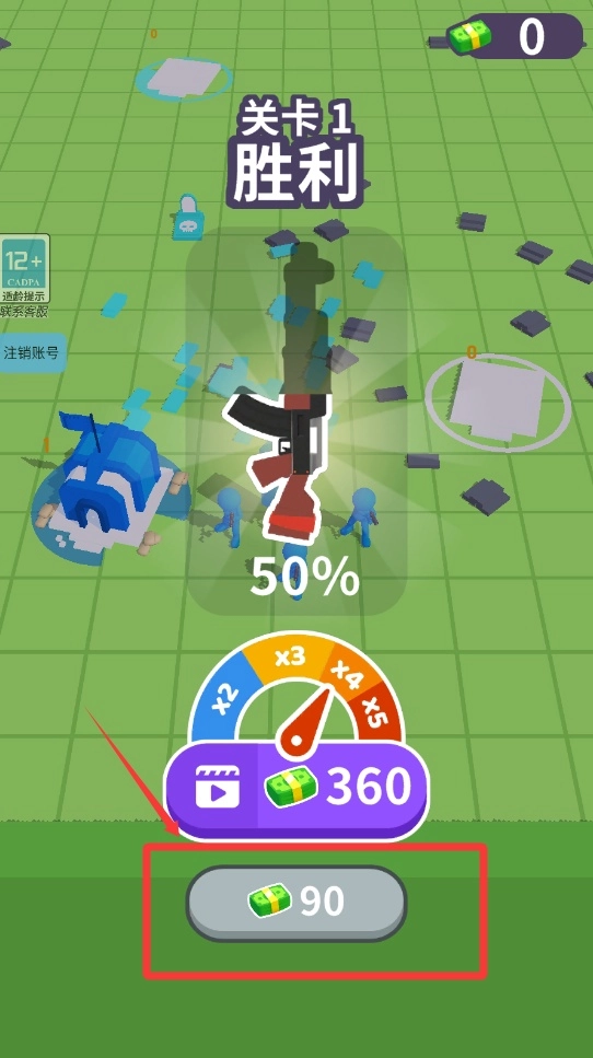 成功击败敌方首领后会弹出结算界面,点击闪烁的90金币图标就能领取奖励,同时解锁更难的关卡。