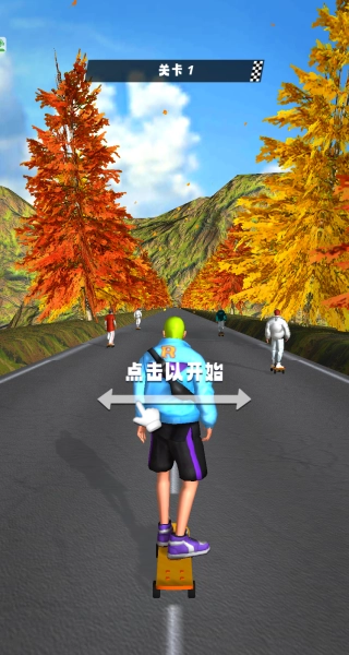 1、进入游戏后,跟随手指指示点击开始,操控角色踏上滑板,快速熟悉滑行的基础节奏与操作逻辑。