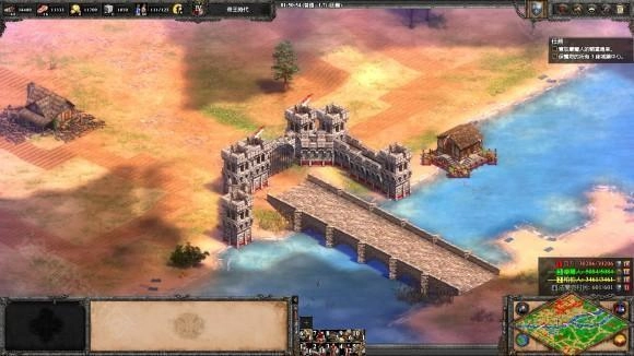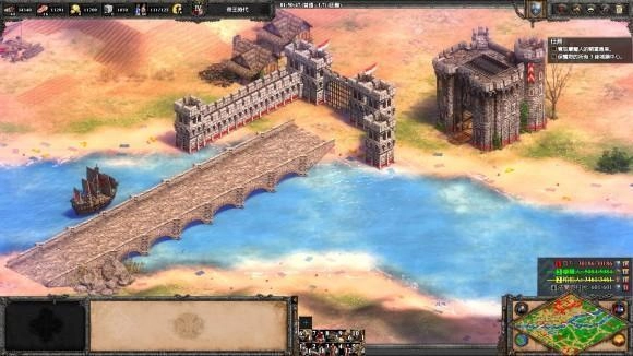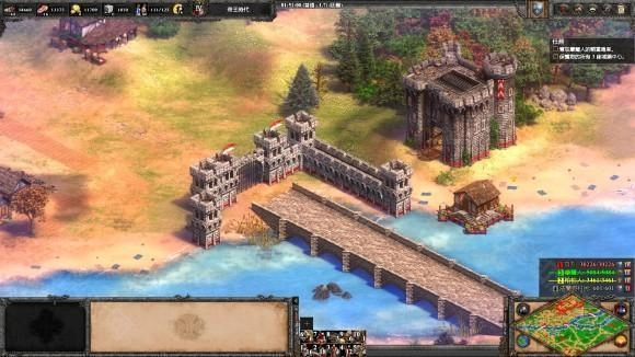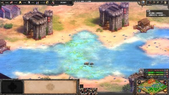 3、 用城墙封锁三座桥梁,接着升级到城堡时代,在9点钟方向的浅滩建造两座城堡,经过一段时间的发育后便可展开反攻。两个敌人的守军都很薄弱,在城堡时代就能消灭迦菲奇,随后攻克摩尔人的阵地,将车辆引出并护送回家即可过关。