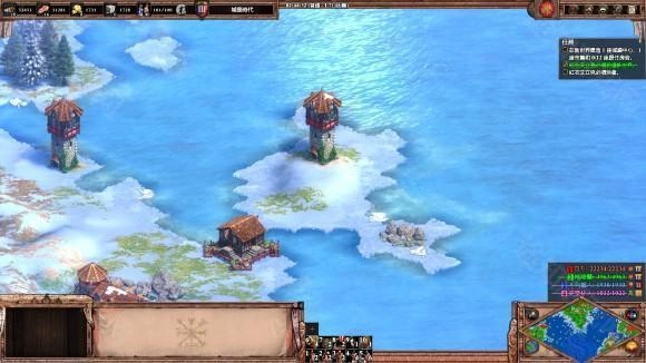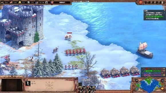 3、进入城堡时代后,选择在格陵兰东北角(1点钟方向)进行登陆。登陆后找到一只企鹅,接着建造一座城堡以稳固己方阵地。之后生产冲车与骑士,用它们摧毁格陵兰的城堡、军营和TC。待对方投降,其会转变为盟友,同时还会在地图上标注出海蠕虫所在的区域。