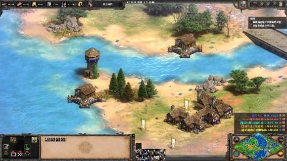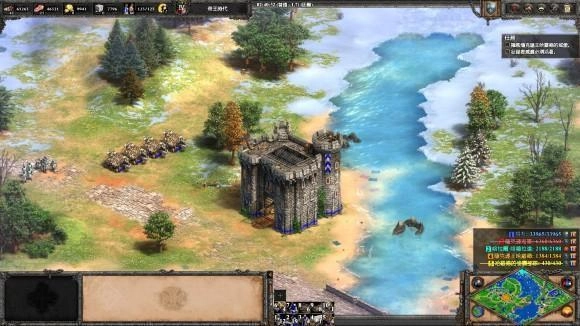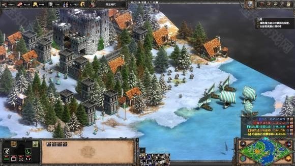 3、地图底部区域分布着大量金矿与石矿资源,可安排部分村民负责开采石料,其余村民则前往左侧的不列颠岛登陆;之后派遣少量骑兵部队清除地图中央的红色营地,再调派海军力量摧毁位于10点钟方向的红色船坞。