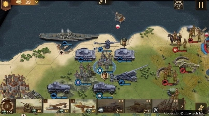 1、这是一款风格简约的二战题材战棋模拟游戏,它真实再现了二战时期动荡不安、名将云集的历史场景。
