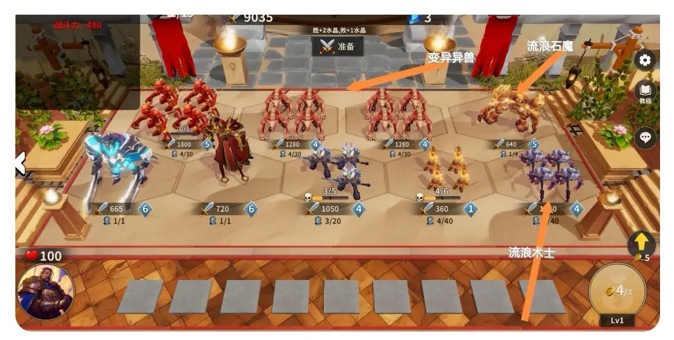 第三回合卖兵,有野狼的话可以上,不过遇到相同连败的话会很难受。兽人勇士记得上场再卖。