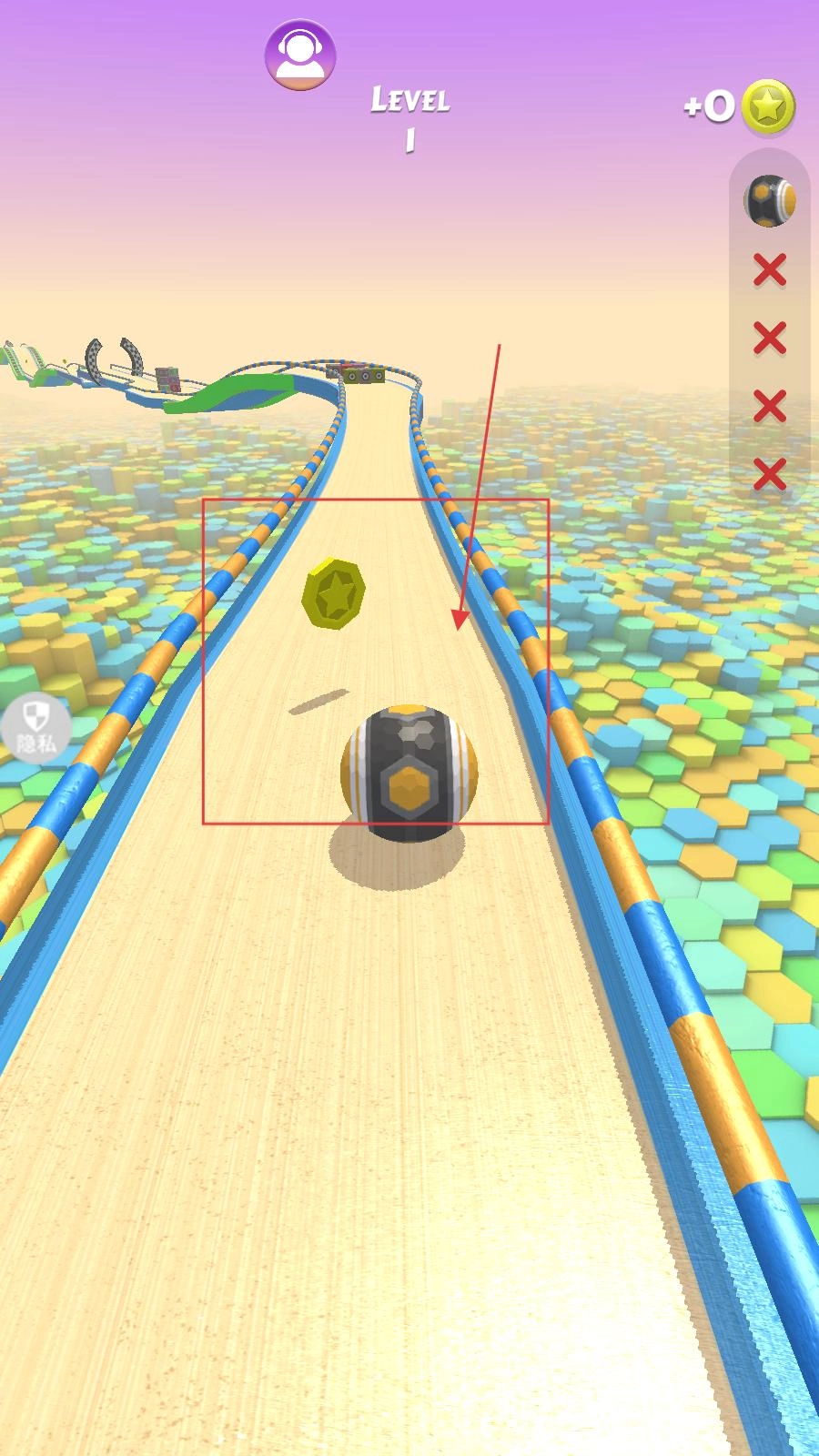玩家可以点击紫色方向键来控制彩球左右移动,让彩球沿着跑道前进,同时要避开两侧的护栏,开启Level1的挑战。