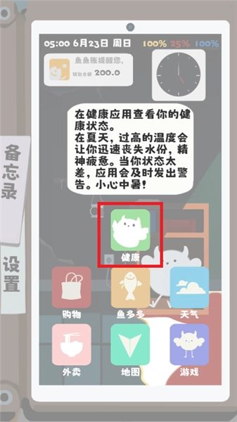 在没有房东提供降温设备的艰难处境下,盛夏的酷热正直接危及生存。从游戏玩法来看,高温会让角色更快脱水、精力消耗加剧,玩家得借助外卖平台及时补充所需,还得依靠地图导航前往各个场所打工或开展经营活动来赚取收入。购物类应用能买到空调等生存必需品,二手交易平台则允许玩家进行资源互换。每天的行动决策都要结合天气应用的预报信息与健康应用显示的实时身体状态,从而打造出极具策略性的生存挑战体验。