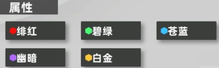 属性的克制关系:绯红克制碧绿、碧绿克制苍蓝、苍蓝克制绯红;幽暗与白金相互克制。