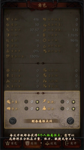 当获得足够的经验值后,我们的角色就会升级,升级后会获得四点自由属性点,自己决定加在哪个属性上,游戏中的属性有四个,力量(越大攻击力越高),敏捷(越大闪避敌人攻击的几率越大),智力(决定了技能的伤害和法力值),体力(决定着我们最大生命值的多少)。自己根据自己的发展方向来决定自己的加点。